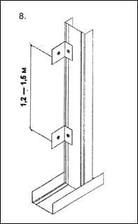 Для увеличения жесткости каркаса стойки крепятся к стене с помощью специальных конвертов, которые устанавливаются через 1,2 - 1,5 м.