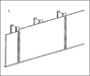 Стойки вставляются между направляющими пола и потолка и вкручиваются в нужное положение. Установка несущих стоек осуществляется с шагом 1,2 м. При расстановке стоек необходимо учитывать толщину стыковочного профиля (W+п, W+T или H). Опорные стойки устанавливаются, посередине, между несущими. Опорная стойка может не устанавливаться в случае, когда расстояние между несущими стойками не более 0,6 м.