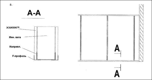 Для улучшения тепло- и звукоизоляции в металлокаркас вдоль стен и перегородок устанавливается минеральная вата толщиной 50 или 100 мм или другой наполнитель.