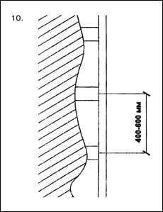 В помещениях с хорошим качеством стены или при ограниченной площади помещений можно монтировать панели непосредственно на стену без металлокаркаса. В этом случае производится разметка стены и установка деревянных маяков там, где есть в этом необходимость непосредственно под W или H - профиль, F и L - профиль через 400 - 600 мм. Крепление профилей осуществляется непосредственно к маякам или стене. При неровности стен до 20 мм можно монтировать панели с помощью различных строительных клеев, таких как «Жидкие гвозди», «Монтажная пена» и др. Клеевые составы наносятся небольшими кучками вдоль панелей с интервалом 35 см и по периметру с минимальным интервалом. Но данные способы крепления являются не являются технологичными и достаточно трудоемки, поэтому их следует использовать в случае крайней необходимости. Такие способы монтажа также приводят к ухудшению звукоизолирующих свойств, вследствие образования узкого воздушного пространства, которое может резонировать.