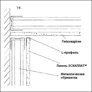 Выставленный металлокаркас зашивается панелями ЭСКАПЛАТ™. Готовые листы поднимают и прижимают к каркасу. Если в качестве плинтуса используется L-профиль, то панель предварительно вставляется в технологический паз L-профиля и крепится к каркасу с помощью W или H - профиля, заранее нарезанного в необходимую длину. Для удобства установки панели в L-профиль рекомендуется использовать шпатель 150-200 мм. W - профиль предварительно закручивается не до конца, позволяя установить второй соседний лист, и только после его установки W - профиль обжимается до упора. В качестве крепежа используется самонарезающие саморезы S8142-25. Технологический паз W - профиля с саморезами закрывается декоративной заглушкой или крышкой.
